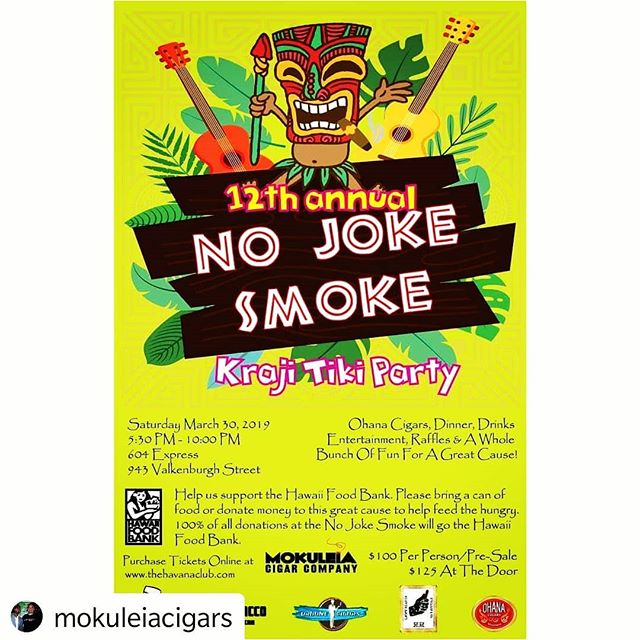 #Repost @mokuleiacigars • • • • • 12th Annual No Joke Smoke 2019!!!! Holly and Ryan Rodriguez from Ohana Cigars/Left Hand Cigars will be joining this years Kraji Tiki Party. Each guest will be treated to a five pack cigars, dinner, giveaways and two beers. Bring your canned food for the Hawaii Food Bank to win awesome prizes. Giving back to Hawaii’s ohana that need our kokua. Ohana Pulse Habano Robusto Ohana Pulse Maduro Robusto Ohana M13 Maduro Robusto Left Hand Cigars Lefthander Toro Left Hand Cigars Blurred Lines Toro Tickets available at www.thehavanaclub.com or message me to buy directly. @mokuleiacigars @ohana_cigars @havanaclubhonolulu @urbanecigars @alohatobacco @nojokesmoke2019 @krajitikiparty